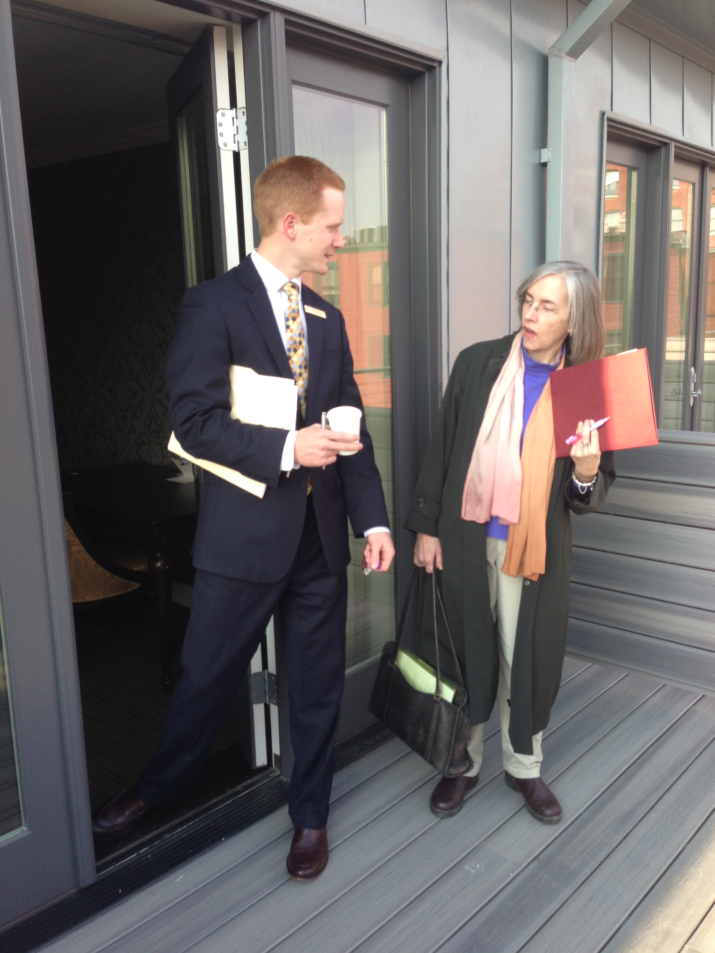 Chas Summers of the Regency and Lisa Marshall discussing the merits of a deck room on the fourth floor of the hotel.